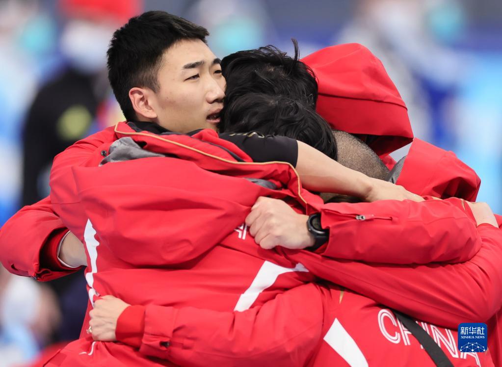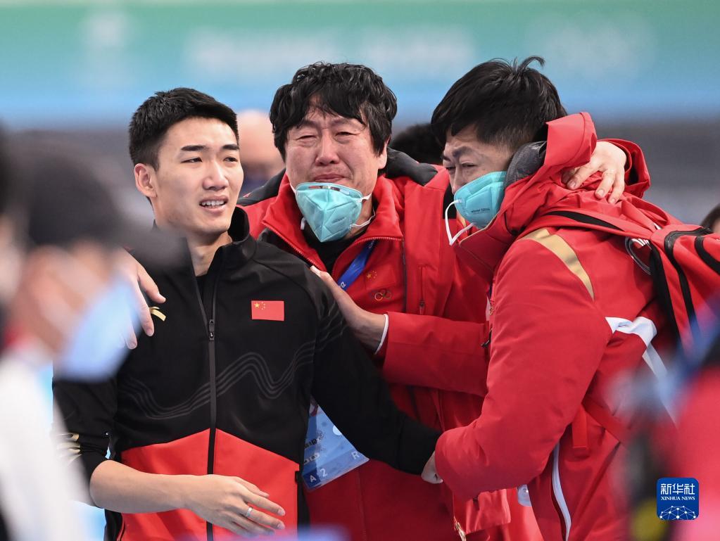 2月12日,中国选手高亭宇(左一)赛后与教练在一起。