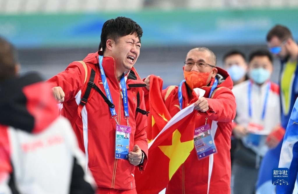 2月12日,中国选手高亭宇在比赛后庆祝。