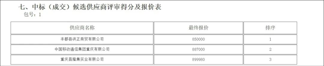 在重庆三峡学院防火墙及DNS设备采购(CQS25A00331)中标(成交)结果公告中,就显示了另外两家供应商的最终报价与排序。中国移动通信集团重庆有限公司最终报价887000元,排名第二;重庆昌隆集实业有限公司最终报价899980元,仅仅比采购预算金额90万元低20元,排名第三。