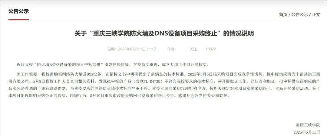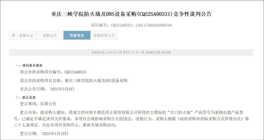 5月10日,“重庆市政府采购网”发布采购终止公告,更正信息一栏中显示,“接采购人通知,原成交供应商丰都县洪正商贸有限公司所投的主要标的‘出口防火墙’产品型号为某路由器产品型号,已确定不满足谈判文件要求,本项目出现影响采购公正的违法、违规行为。采购人根据《政府采购非招标采购方式管理办法》第三十七条规定,决定本项目采购终止,重新开展采购活动。”