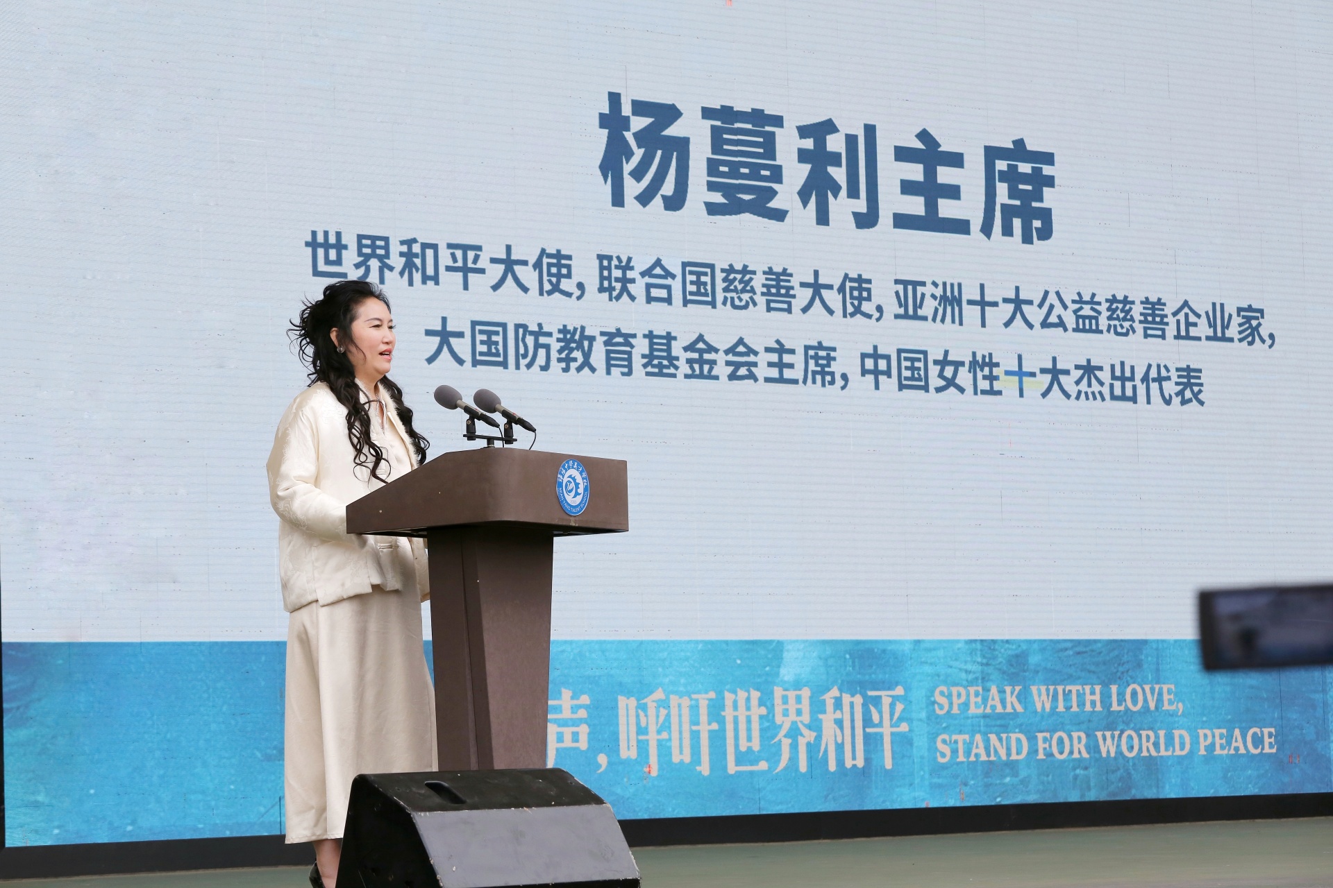 升旗仪式后,嘉宾依次致辞。杨蔓利分享了参与和平公益的感悟,对活动意义给予肯定,并向青少年寄语。
