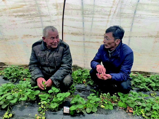 光明日报记者常河在蒙洼老观乡草莓采摘园采访。