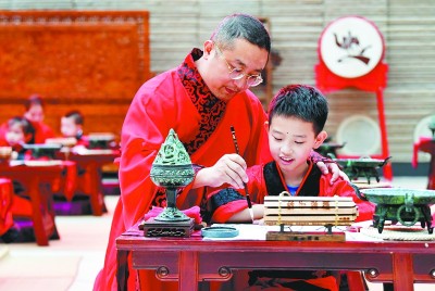 西安大唐西市博物馆举行学童“开笔破蒙”活动。新华社发