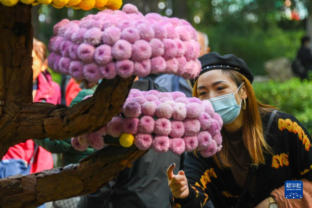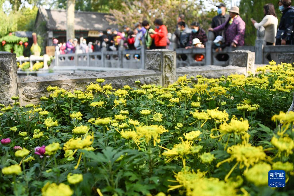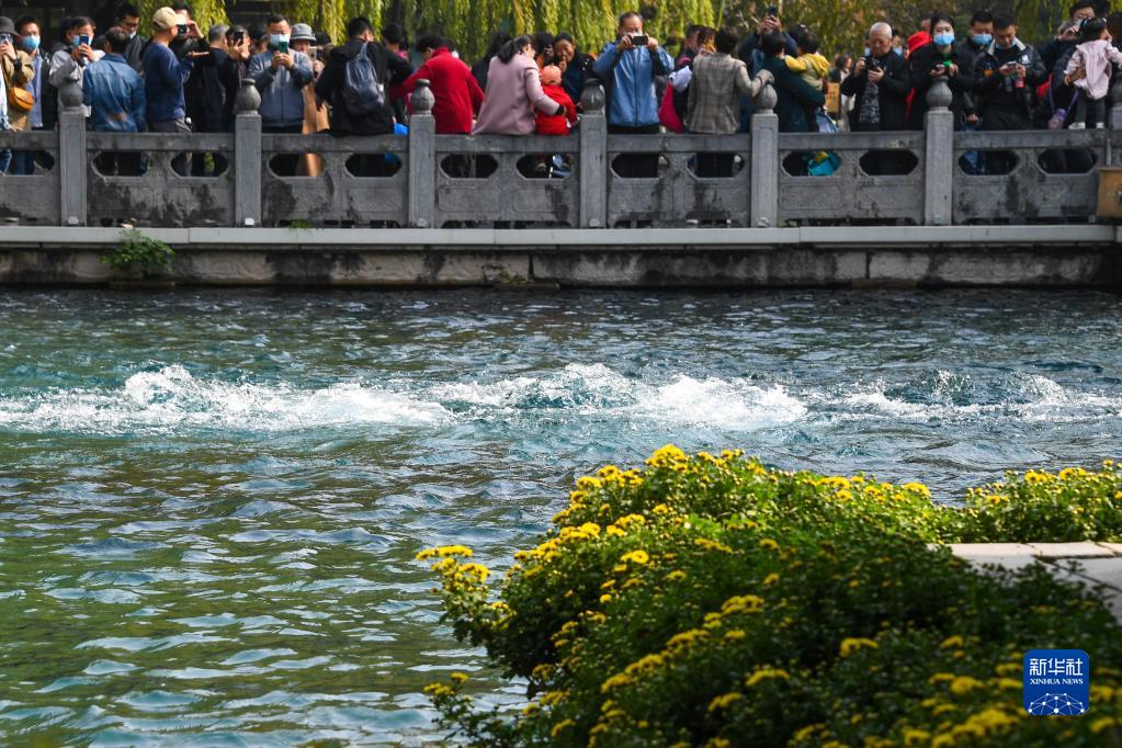 当日,第四十二届趵突泉金秋菊展在济南趵突泉公园开展,盛开的菊花和喷涌的泉水吸引众多游客前来观赏。(新华社记者 朱峥 摄)