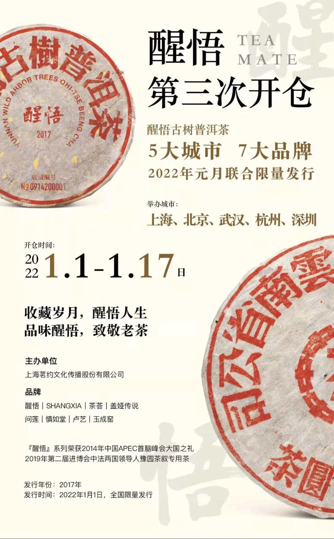 醒悟普洱茶迎来第三次开仓。作为一年一度的开仓盛会,本次醒悟开仓于2022年1月1日至1月17日,在上海、北京、深圳、杭州、武汉五大城市举办专场开仓藏茶活动。同时与爱马仕旗下SHANGXIA上下、茶荟生活、盖娅传说等品牌联名发布和发售醒悟系列产品。