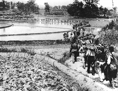新四军挺进华中敌后,广泛发动群众,开展抗日游击战争,创建抗日根据地,开辟了广阔的华中敌后战场。图为新四军挺进敌后。 |