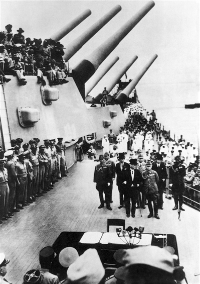 1945年8月15日,日本宣布无条件投降。9月2日,在东京湾的美国“密苏里”号战列舰上,举行日本向同盟国投降签字仪式。图为日本投降签字现场。 |