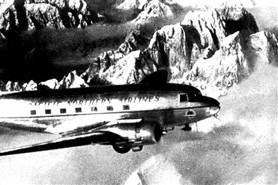 从1942年5月至1945年9月,绝大部分同盟国援华军用物资自印度汀江通过“驼峰航线”运到昆明,共向中国运输战略物资80多万吨。图为在雪峰间穿行的C—47运输机。 |