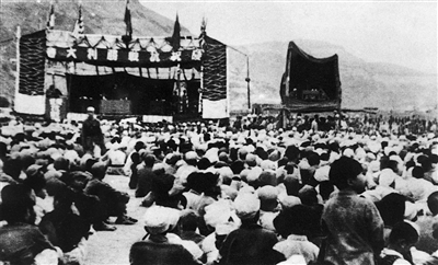 中国人民经过14年不屈不挠的浴血奋战,打败了穷凶极恶的日本军国主义侵略者,取得了中国人民抗日战争的伟大胜利。图为延安军民庆祝抗战胜利。 |