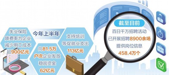 上半年,稳就业政策支持力度进一步加大,确立了“支持企业稳定一批、开发岗位承接一批、优化服务转移一批、加强培训储备一批、强化保障兜底一批”的思路,着力稳就业、稳企业、稳市场、稳预期。
