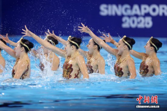 7月22日,在新加坡举行的2025年世界游泳锦标赛花样游泳集体技术自选决赛中,中国队夺得金牌。 中新社记者 富田 摄