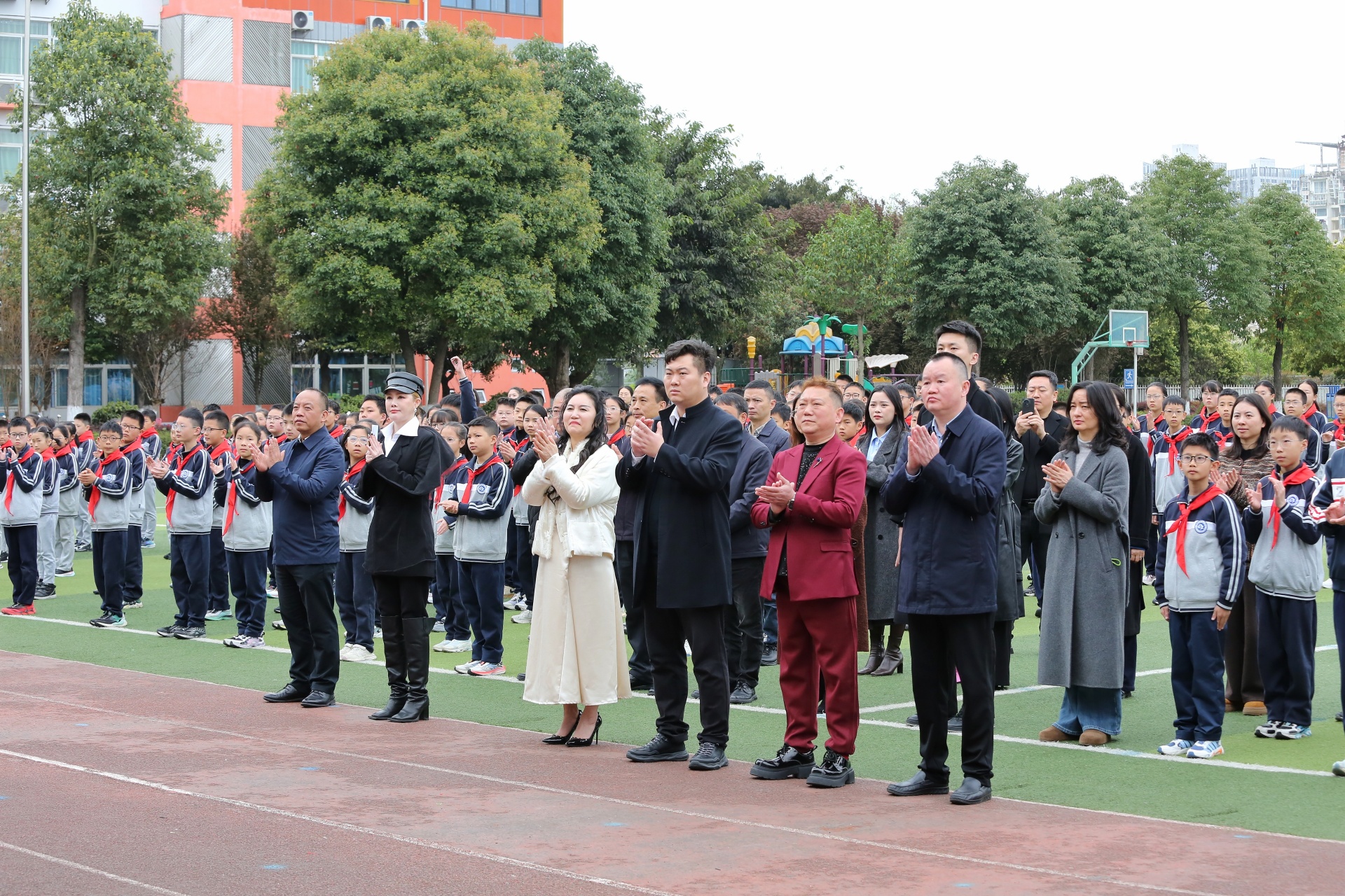 活动现场首先举行了升旗仪式。全体人员面向旗台升国旗、奏唱国歌,少先队员行队礼,其他人员行注目礼。