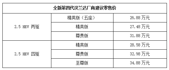 6月25日,广汽丰田TNGA豪华大型SUV全新第四代汉兰达正式上市。新车推出2.5L双擎两驱和四驱共6大配置版本,厂商建议零售价26.88万-34.88万元。
