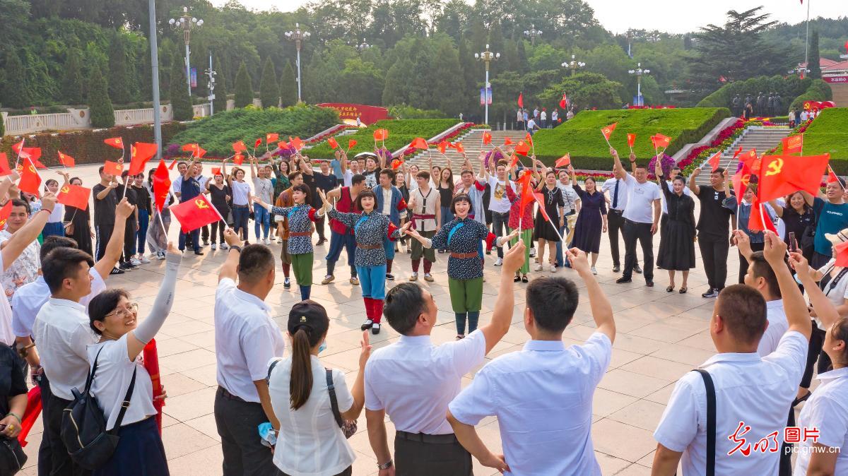 2021年6月27日,河北省平山县西柏坡景区,演职人员正与围观游客共同唱响歌剧《洪湖赤卫队》主题曲《洪湖水、浪打浪》。当日,西柏坡景区,湖北省歌剧舞剧院《洪湖赤卫队》剧组演职人员们在西柏坡纪念广场上进行“红色经典”主题快闪活动。(刘帅冶摄/光明图片)